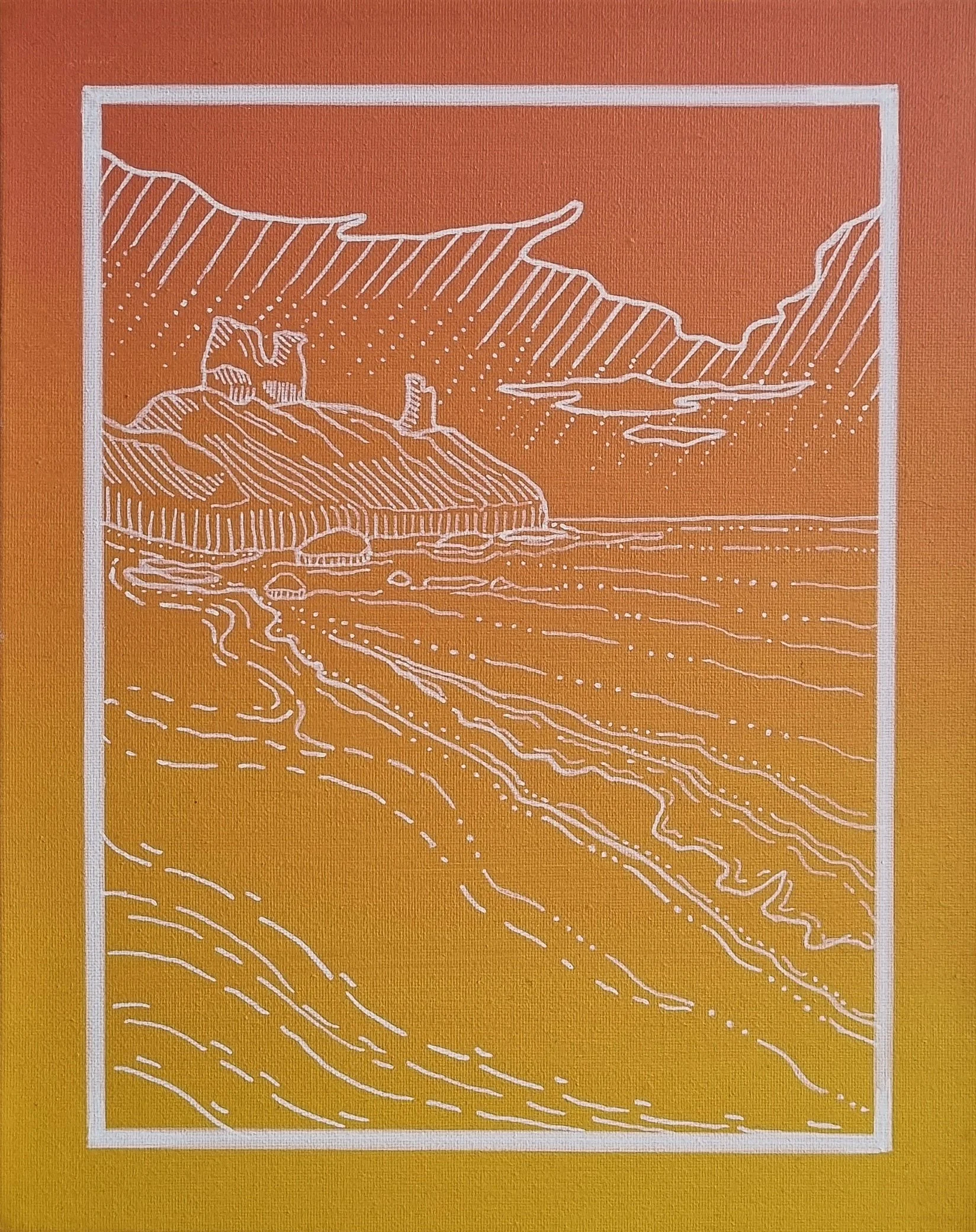 Against the mesmerizing gradient of orange and yellow hues, our eyes are drawn to the Black Castle of Wicklow as the sun sets. The castle’s dark silhouette stands out against the vibrant backdrop, while the beach below softly glows in the waning light. Gentle waves lap at the shore, reflecting the warm colours and adding a serene rhythm that we can almost feel.