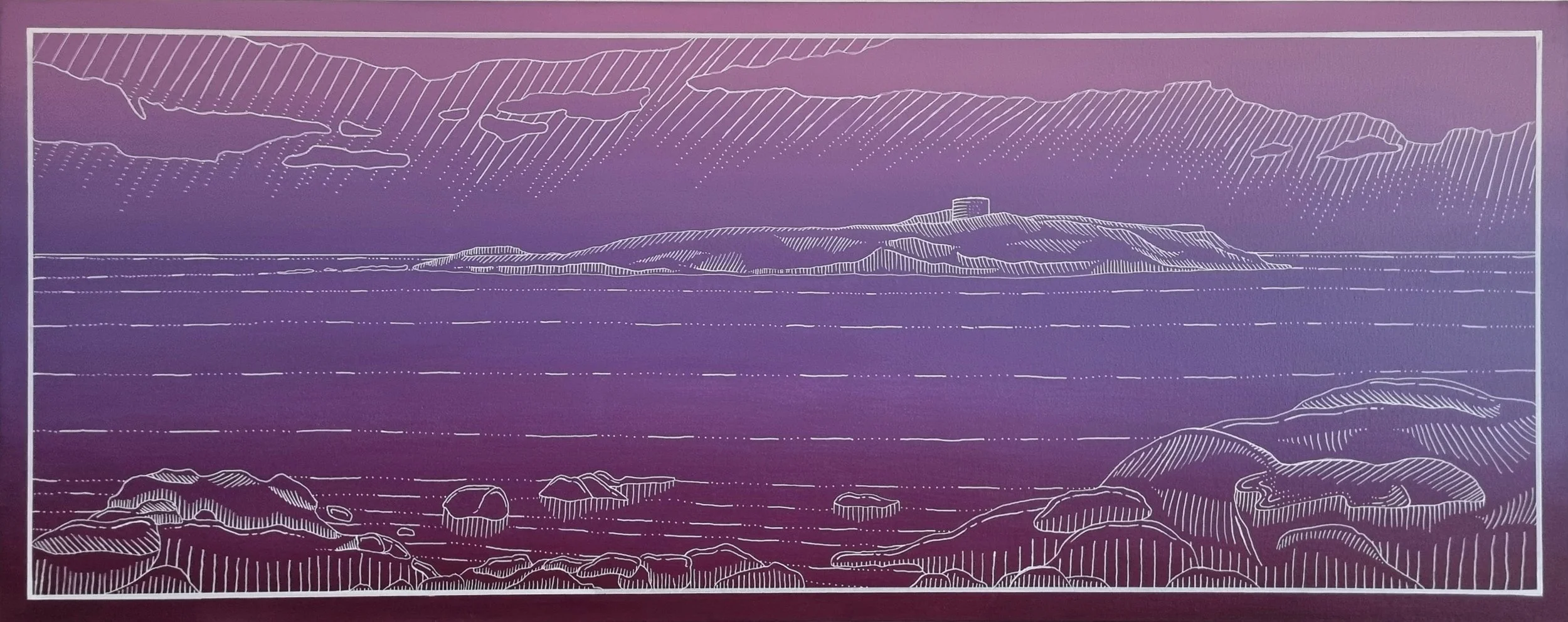 As the sun sets over Dalkey Island, the sky transforms into a breathtaking gradient of purple. The rich lavender at the top transitions into deeper shades of violet. This stunning display casts a serene, ethereal glow over the sea, with the island silhouetted against the vibrant backdrop.